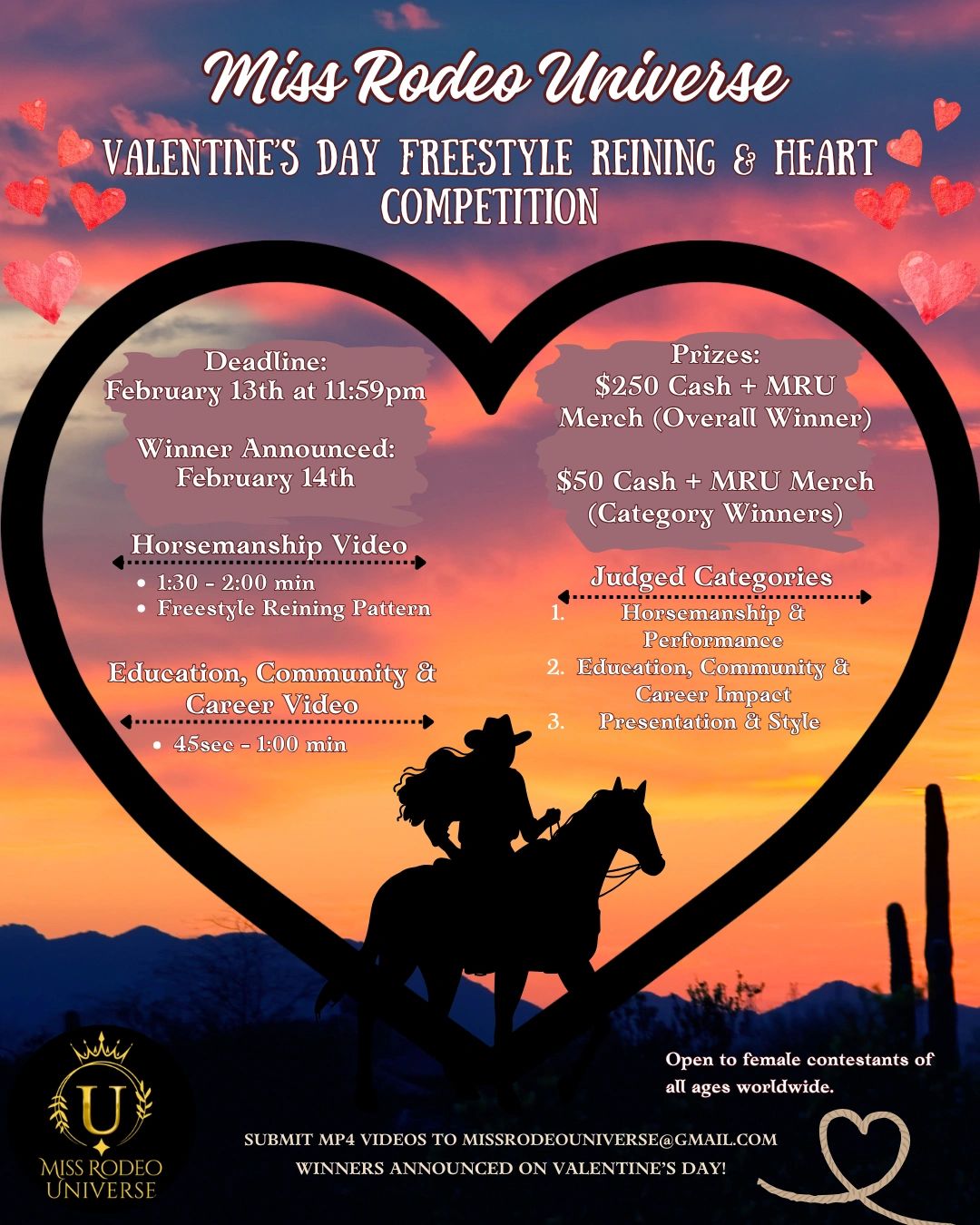 Miss Rodeo Universe proudly presents the Valentine’s Day Freestyle Reining & Heart Competition, an international virtual competition celebrating horsemanship, education, community service, career success, and western style.