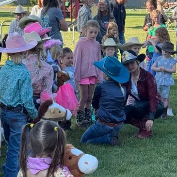 Our titleholders are great hands and ready to volunteer. They can help with carrying flags, picking up mutton busters, pushing cows out of the arena, and bringing a bright smile while engaging with the crowd.
